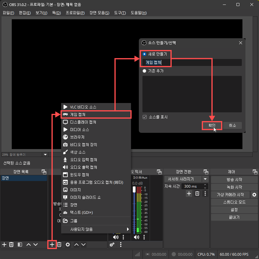 메인화면의 소스목록에서 [+] 버튼을 클릭해 게임 캡쳐를 추가하세요.