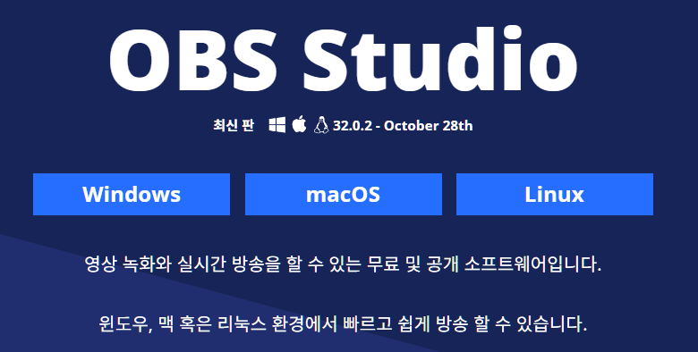 영상 녹화와 실시간 방송을 할 수 있는 무료 및 공개 소프트웨어입니다. 윈도우, 맥 혹은 리눅스 환경에서 빠르고 쉽게 방송 할 수 있습니다.