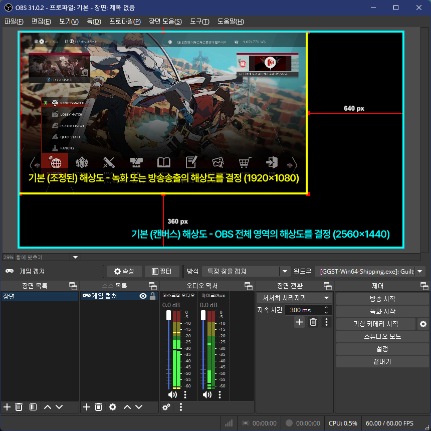사용자 PC 모니터 해상도에 맞게 설정하세요. OBS 전체 영역의 해상도를 결정합니다.